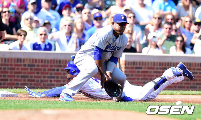 20일(이하 한국시간) 미국 일리노이주 시카고 리글리 필드에서 열린 '2014 메이저리그' LA 다저스와 시카고 컵스의 경기, 1회말 1사 2루에서 컵스 솔레어가 1타점 적시 3루타를 날리고 다저스 유리베의 태그에 앞서 세이프되고 있다.