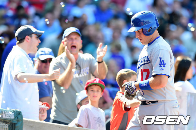 20일(이하 한국시간) 미국 일리노이주 시카고 리글리 필드에서 열린 '2014 메이저리그' LA 다저스와 시카고 컵스의 경기, 3회초 2사 1루에서 다저스 A.J 엘리스가 연타석 투런포를 날리고 더그아웃으로 향하고 있다.