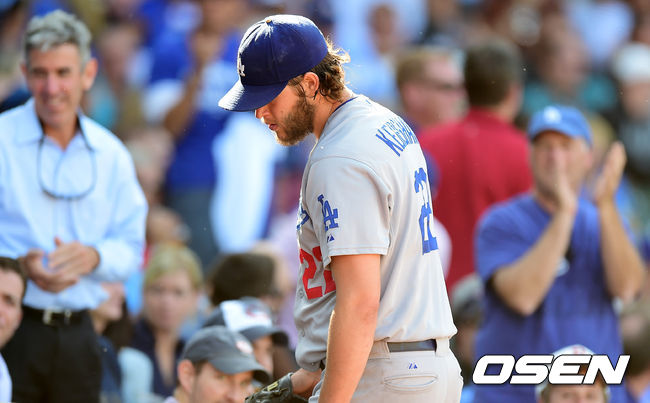 20일(이하 한국시간) 미국 일리노이주 시카고 리글리 필드에서 열린 '2014 메이저리그' LA 다저스와 시카고 컵스의 경기, 5회말 수비를 마친 커쇼가 더그아웃으로 향하고 있다. 5이닝 3실점을 허용한 커쇼는 6회초 타석에 피더슨과 교체됐다.