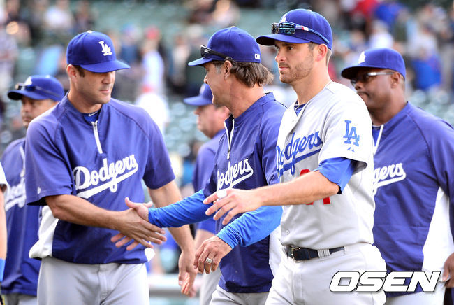 경기후 다저스 매팅리 감독이 코칭스태프와 인사를 나누고 있다./jpnews@osen.co.kr