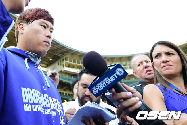 류현진이 취재진에 둘러싸여 인터뷰를 하고 있다./jpnews@osen.co.kr
