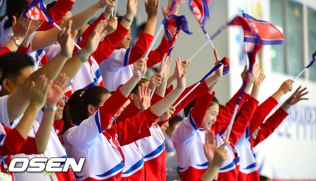 20일 오전 인천 문학동 문학박태환수영장에서 열린 2014 인천아시안게임 싱크로나이즈스위밍 듀엣경기, 북한 리지향과 김종휘의 연기 북한 응원단이 열띤 응원을 펼치고 있다.