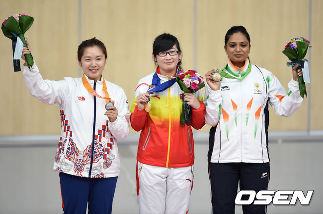 은메달을 목에 건 한국 정지혜가 중국 장 멩유안, 인도 찬드리 스웨타와 시상식을 갖고 있다. /sunday@osen.co.kr