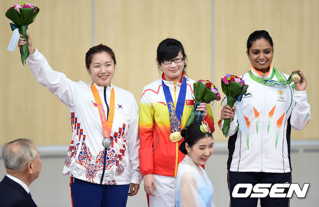 은메달을 목에 건 한국 정지혜가 중국 장 멩유안, 인도 찬드리 스웨타와 시상식을 갖고 있다. /sunday@osen.co.kr