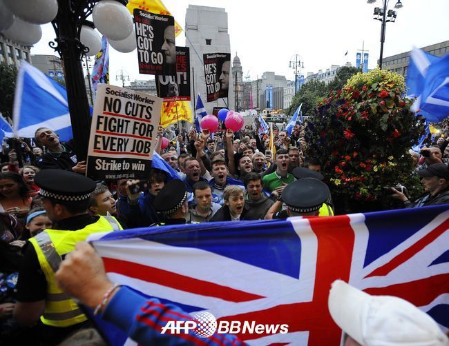 이날 로이터 통신에 따르면 스코틀랜드 분리독립 주민투표 당일 최종 여론조사 결과 분리독립 반대가 54%로 조금 우세한 것으로 알려졌다. 여론조사 결과가 그대로 적중했다.