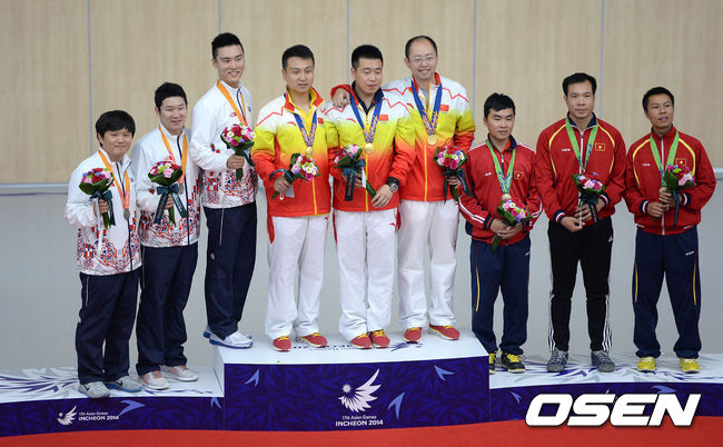 진종오(35, KT), 이대명(26, KB국민은행), 최영래(32, 청원군청)로 구성된 한국선수단은 20일 오전 10시 인천 옥련사격장에서 개최된 2014 인천 아시안게임 사격 남자 50m 권총 단체전에서 1800점 만점 중 총점 1670-31X점을 쏘아 은메달을 차지했다. 금메달은 1692-42X점을 쏜 중국이 차지했다. 1670-25X점의 베트남은 동메달을 목에 걸게 됐다.