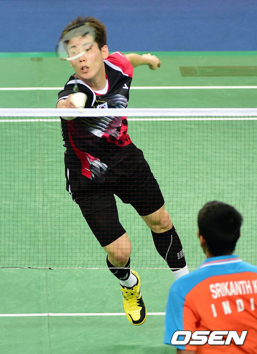 20일 오후 인천 계양체육관에서 열린 제17회 인천 아시안게임 배드민턴 남자 단체전 16강전 한국과 인도의 경기에서 손완호가 경기를 펼치고 있다.