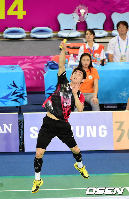 20일 오후 인천 계양체육관에서 열린 제17회 인천 아시안게임 배드민턴 남자 단체전 16강전 한국과 인도의 경기에서 손완호가 경기를 펼치고 있다.