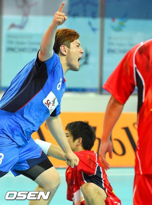 20일 오후 인천 선학핸드볼경기장에서 열린 2014 인천 아시안게임 핸드볼 남자 D조 조별리그 첫 경기 한국과 일본의 대결,전반 박중규가 골을 넣은 뒤 환호하고 있다