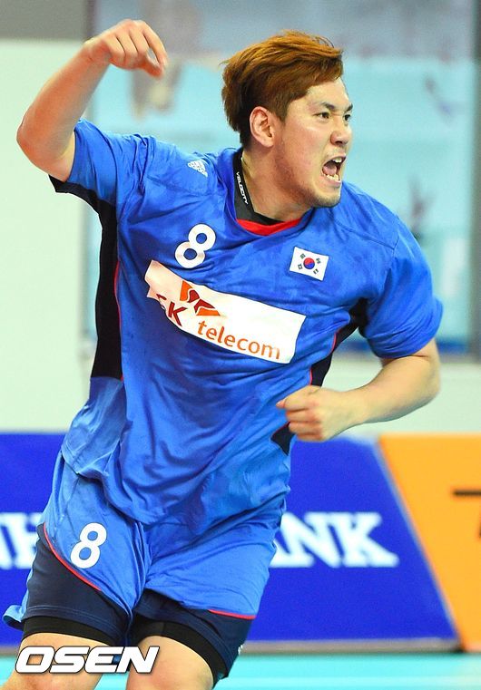 20일 오후 인천 선학핸드볼경기장에서 열린 2014 인천 아시안게임 핸드볼 남자 D조 조별리그 첫 경기 한국과 일본의 대결,전반 박중규가 골을 넣은 뒤 환호하고 있다