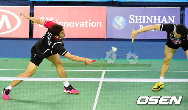 20일 오후 인천 계양체육관에서 열린 제17회 인천 아시안게임 배드민턴 남자 단체전 16강전 한국과 인도의 경기에서 이용대-유연성이 경기를 펼치고 있다.