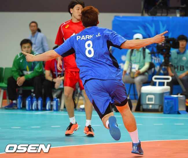 20일 오후 인천 선학핸드볼경기장에서 열린 2014 인천 아시안게임 핸드볼 남자 D조 조별리그 첫 경기 한국과 일본의 대결,전반 박중규가 골을 넣은 뒤 환호하고 있다