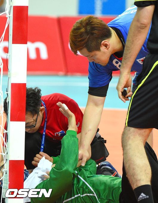 20일 오후 인천 선학핸드볼경기장에서 열린 2014 인천 아시안게임 핸드볼 남자 D조 조별리그 첫 경기 한국과 일본의 대결,전반 박중규가 자신의 공에 맞아쓰러진 일본 골키퍼에게 사과를 하고 있다