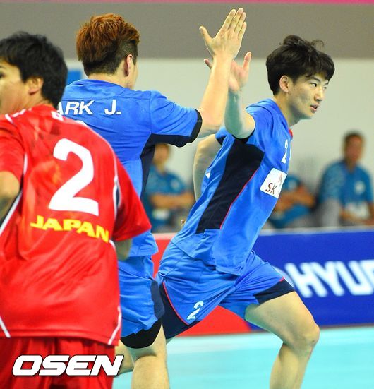 20일 오후 인천 선학핸드볼경기장에서 열린 2014 인천 아시안게임 핸드볼 남자 D조 조별리그 첫 경기 한국과 일본의 대결,전반 박중규의 어시스트 공을 정의경이 골로 성공시킨뒤 하이파이브를 하고 있다.