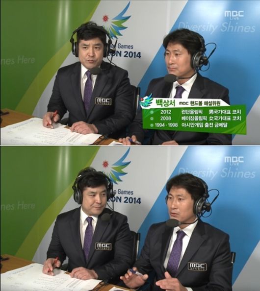 20일 오후 1시 55분부터 전파를 탄 MBC '2014 인천아시안게임' 핸드볼 남자 D조 예선 대한민국과 일본의 경기 중계는 김완태 캐스터와 백상서 해설위원이 호흡을 맞췄다.