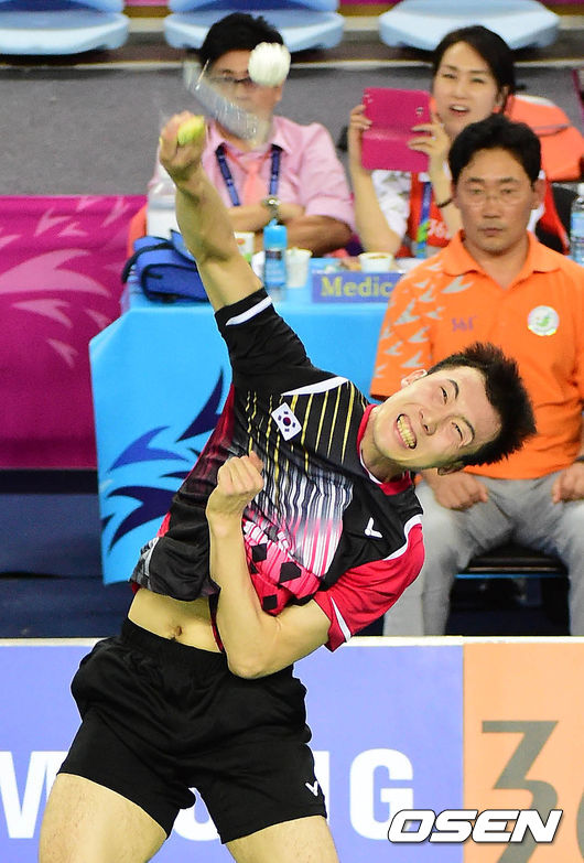 20일 오후 인천 계양체육관에서 열린 제17회 인천 아시안게임 배드민턴 남자 단체전 16강전 한국과 인도의 경기에서 유연성이 공격을 펼치고 있다.