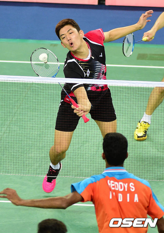20일 오후 인천 계양체육관에서 열린 제17회 인천 아시안게임 배드민턴 남자 단체전 16강전 한국과 인도의 경기에서 이용대가 경기를 펼치고 있다.