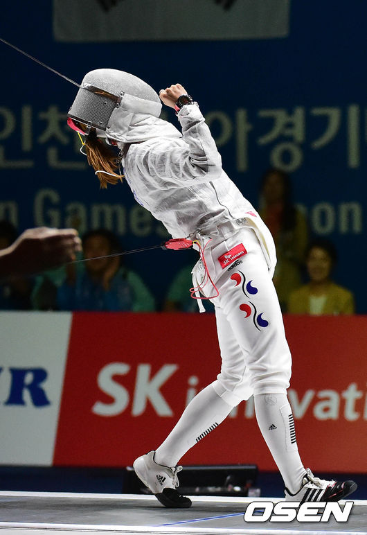20일 오후 고양실내체육관에서 열린 제17회 인천 아시안게임 펜싱 여자 사브르 개인 준결승전, 김지연이 결승 진출을 확정 짓고 기뻐하고 있다.