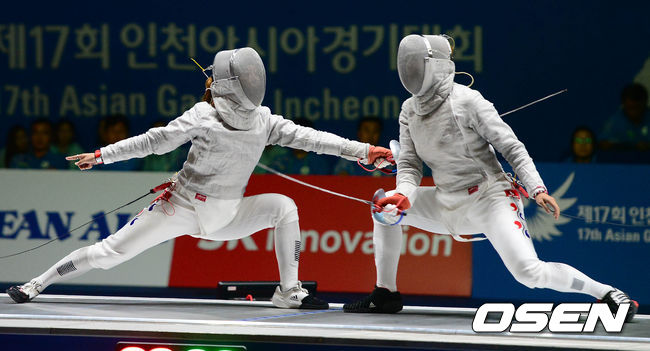 20일 오후 고양실내체육관에서 열린 제17회 인천 아시안게임 펜싱 여자 사브르 개인 결승전 김지연과 이라진이 경기를 펼치고 있다.