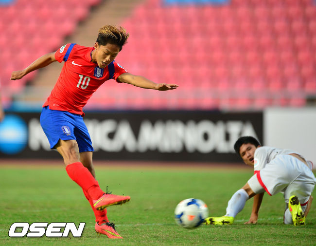 20일 오후 태국 방콕 라자망갈라 스타디움에서 열린 한국과 북한의 2014 아시아축구연맹(AFC) U-16 챔피언십 결승전, 전반 한국 이승우가 돌파를 시도하고 있다.
