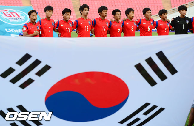20일 오후 태국 방콕 라자망갈라 스타디움에서 열린 한국과 북한의 2014 아시아축구연맹(AFC) U-16 챔피언십 결승전, 전반 한국 대표팀이 국기에 대한 경례를 하고 있다.