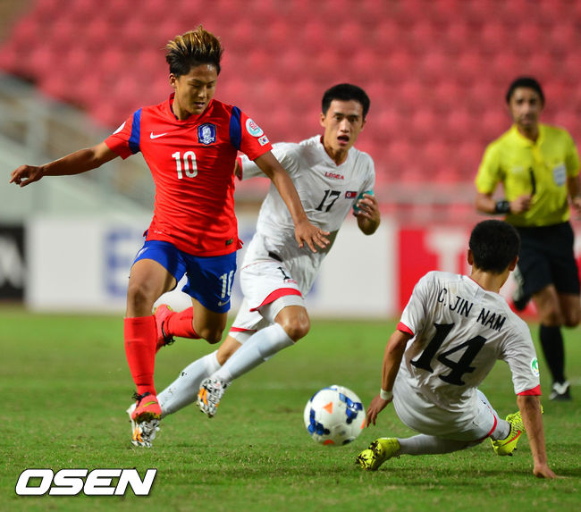 20일 오후 태국 방콕 라자망갈라 스타디움에서 열린 한국과 북한의 2014 아시아축구연맹(AFC) U-16 챔피언십 결승전, 전반 한국 이승우가 돌파를 시도하고 있다.