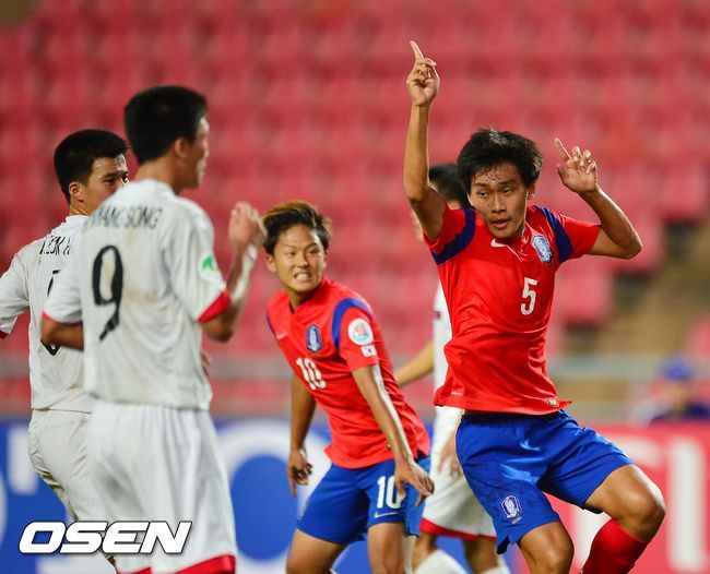 20일 오후 태국 방콕 라자망갈라 스타디움에서 열린 한국과 북한의 2014 아시아축구연맹(AFC) U-16 챔피언십 결승전, 전반 한국 최재영이 헤딩슛으로 선제골에 성공한 후 기뻐하고 있다.