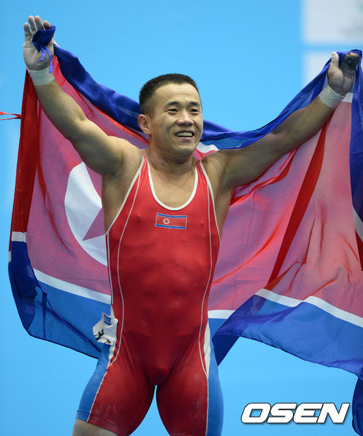 세계신기록을 갈아치우며 금메달을 차지한 북한 엄윤철이 환호하고 있다. /sunday@osen.co.kr