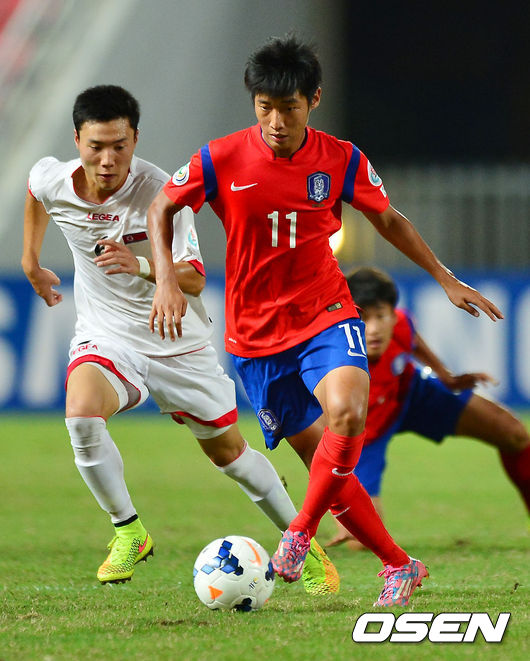 20일 오후 태국 방콕 라자망갈라 스타디움에서 열린 한국과 북한의 2014 아시아축구연맹(AFC) U-16 챔피언십 결승전, 전반 한국 장결희가 돌파를 시도하고 있다.