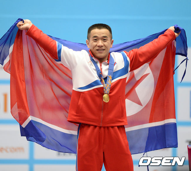 세계신기록을 갈아치우며 금메달을 차지한 북한 엄윤철이 환호하고 있다. /sunday@osen.co.kr