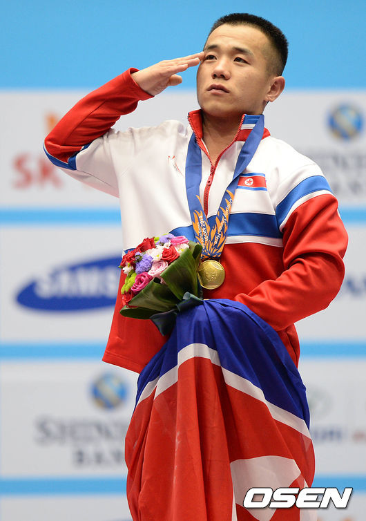 세계신기록을 갈아치우며 금메달을 차지한 북한 엄윤철이 시상대에서 국가를 듣고 있다. /sunday@osen.co.kr