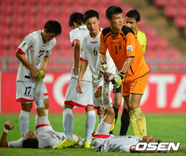 20일 오후 태국 방콕 라자망갈라 스타디움에서 열린 한국과 북한의 2014 아시아축구연맹(AFC) U-16 챔피언십 결승전, 후반 앞서가는 북한 선수들이 고통을 호소하며 누워있다.