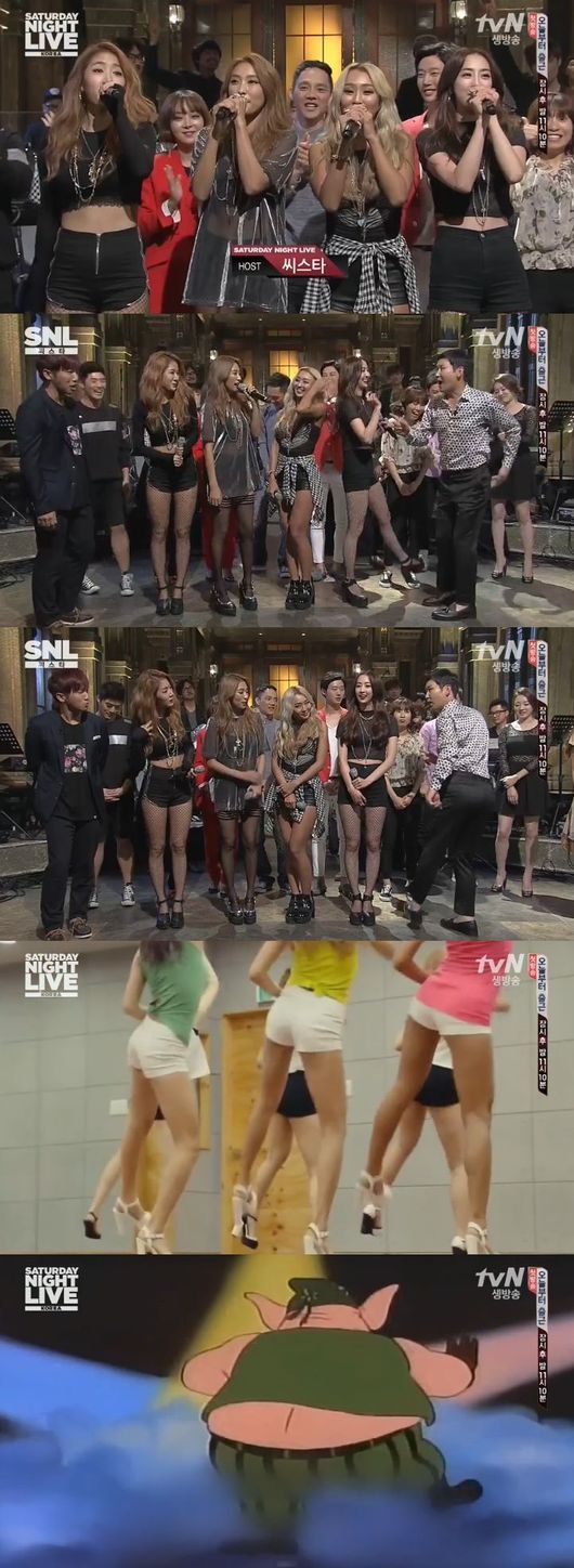 씨스타는 20일 오후 방송된 tvN 'SNL코리아'에서 호스트로 등장, 히트곡들을 나열하며 섹시한 오프닝을 열었다. 오프닝 후 무대로 모인 크루들과 관객들은 뜨겁게 환호했다.