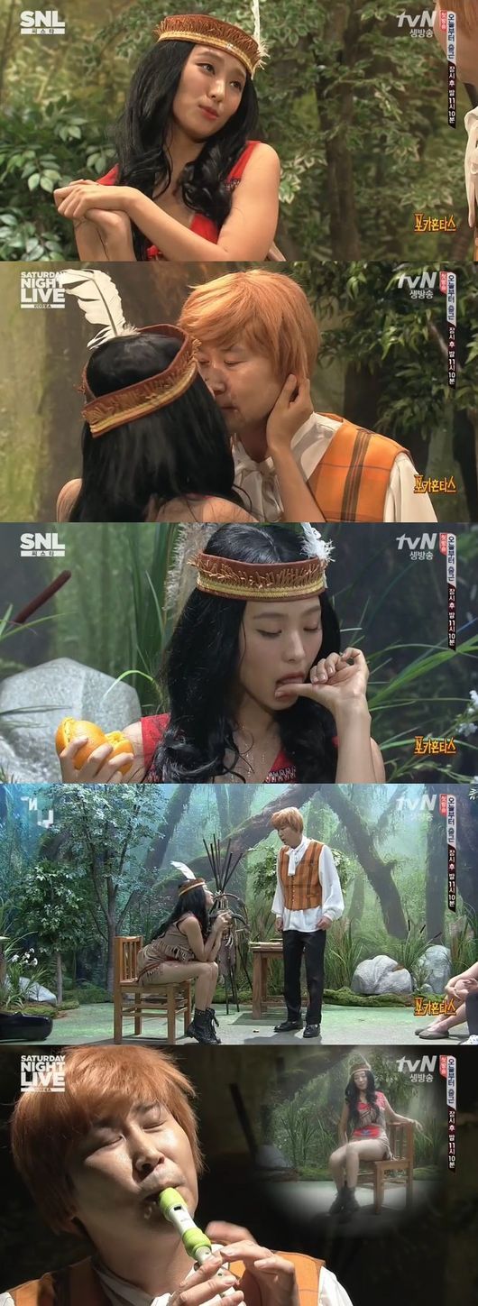 이날 보라가 순수한 아름다움을 간직한 원주민 여인으로 변신하는 코너 '포카혼타스'에서는 신동엽이 선교사 '존 스미스'로 등장해 호흡을 맞춰 눈길을 사로잡았다.