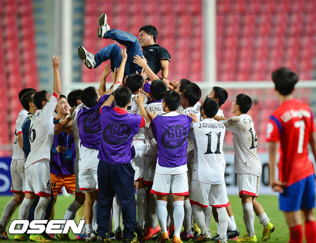 경기를 마치고 북한의 연광무 감독이 행가레를 받고 있다. / rumi@osen.co.kr