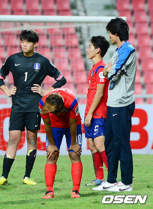 경기를 마치고 한국 이승우가 고개를 떨구고 있고 최진철 감독이 아쉬워하고 있다./ rumi@osen.co.kr