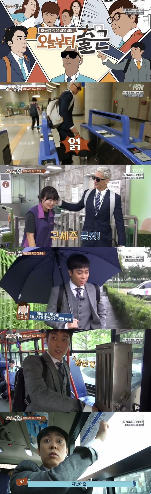 20일 오후 방송된 tvN '오늘부터 출근'(연출 고민구)은 직장에 첫 출근하는 김성주, 은지원, god 박준형, JK김동욱, 로이킴, 홍진호, 쥬얼리 김예원, 모델 이현이 등 총 8명의 모습이 그려졌다. 이중 '냉동 연예인' 박준형과 은지원은 낯선 지하철과 버스에서 헤매는 모습으로 눈길을 끌었다.