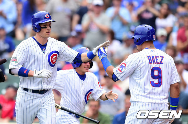 21일(이하 한국시간) 미국 일리노이주 시카고 리글리 필드에서 열린 '2014 메이저리그' LA 다저스와 시카고 컵스의 경기, 1회말 무사에서 컵스 코글란이 선두타자 홈런을 날리고 기뻐하고 있다.