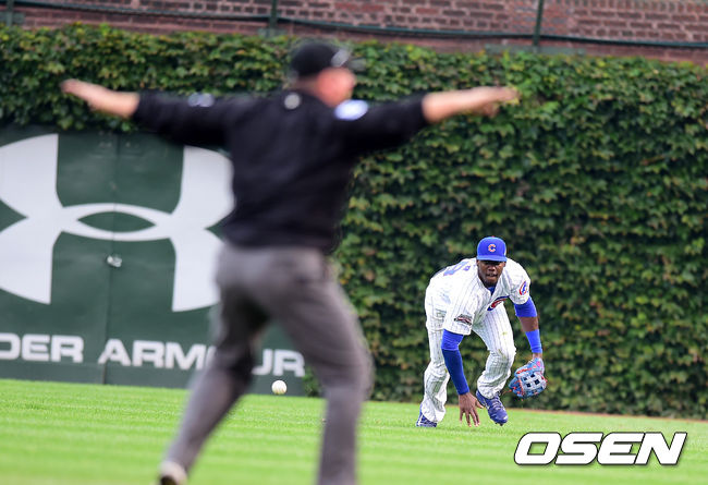 21일(이하 한국시간) 미국 일리노이주 시카고 리글리 필드에서 열린 '2014 메이저리그' LA 다저스와 시카고 컵스의 경기, 3회초 무사에서 컵스 솔레어가 다저스 고든의 우전 안타 타구를 아쉽게 놓치고 있다.