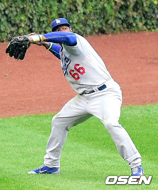 21일(이하 한국시간) 미국 일리노이주 시카고 리글리 필드에서 열린 '2014 메이저리그' LA 다저스와 시카고 컵스의 경기, 5회말 1사 1,2루에서 다저스 푸이그가 컵스 솔레어의 안타성 타구를 몸 날려 잡아내고 2루로 송구하고 있다. 2루 주자 코글란도 잡으며 더블아웃. 이닝 종료.