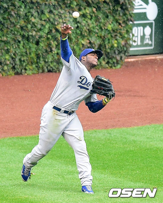 21일(이하 한국시간) 미국 일리노이주 시카고 리글리 필드에서 열린 '2014 메이저리그' LA 다저스와 시카고 컵스의 경기, 5회말 1사 1,2루에서 다저스 푸이그가 컵스 솔레어의 안타성 타구를 몸 날려 잡아내고 2루로 송구하고 있다. 2루 주자 코글란도 잡으며 더블아웃. 이닝 종료.