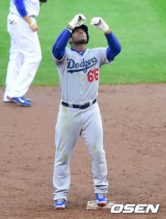 21일(이하 한국시간) 미국 일리노이주 시카고 리글리 필드에서 열린 '2014 메이저리그' LA 다저스와 시카고 컵스의 경기, 6회초 2사에서 다저스 푸이그가 2루타를 날리고 세리머니를 하고 있다.