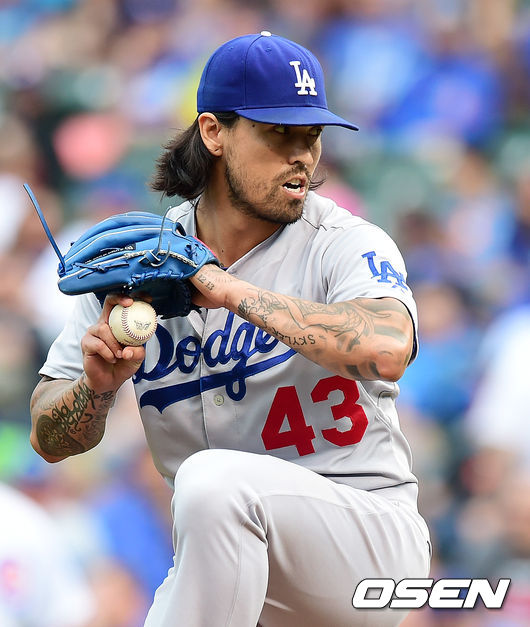 21일(이하 한국시간) 미국 일리노이주 시카고 리글리 필드에서 열린 '2014 메이저리그' LA 다저스와 시카고 컵스의 경기, 7회말 2사에서 마운드에 오른 다저스 리그가 역투하고 있다.