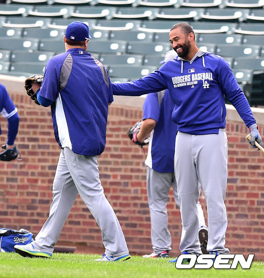 경기에 앞서 다저스 류현진이 맷 켐프와 반갑게 인사를 나누고 있다./jpnews@osen.co.kr