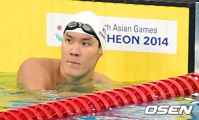 21일 오전 인천 문학박태환수영장에서 열린 제17회 인천 아시안게임 남자 자유형 200m 예선에서 박태환이 경기 후 기록 전광판을 바라보고 있다.