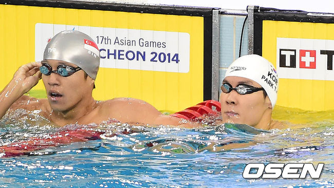 21일 오전 인천 문학박태환수영장에서 열린 제17회 인천 아시안게임 남자 자유형 200m 예선에서 박태환이 경기 후 기록 전광판을 바라보고 있다.