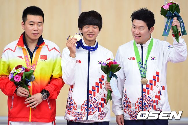남자 10m 공기권총 개인전 시상식에서 김청용와 진종오가 포즈를 취하고 있다./soul1014@osen.co.kr