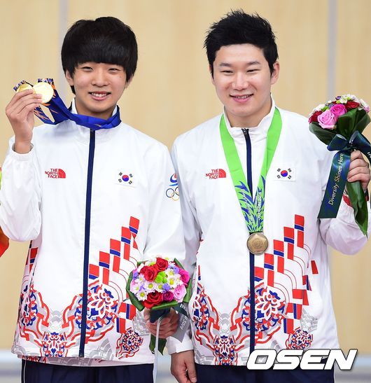 남자 10m 공기권총 개인전 시상식에서 김청용과 진종오가 포즈를 취하고 있다./soul1014@osen.co.kr