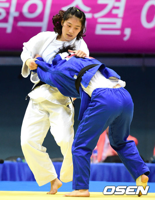 21일 오전 인천 도원체육관에서 열린 제17회 인천 아시안게임 유도 여자 16강에서 김잔디가 경기를 펼치고 있다.