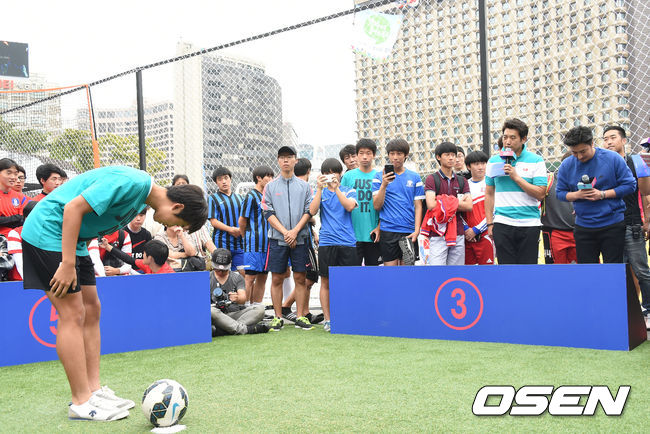 챌린지 드리블 행사에 참가한 선수가 안정환 위원에게 인사를 하고 있다.